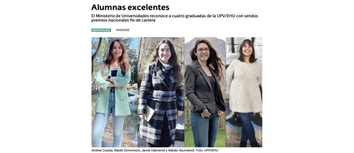 The Ministry of Universities awards Janire Otamendi Jauregi (PhD student of VISENS Research group) for her excellent university studies with the second prize in the area of Engineering and Architecture in the National End of Degree Awards for University Education. See more details in: https://www.ehu.eus/es/-/alumnas-excelentes.