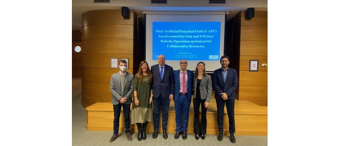 In 17 December 2023, took place the defense of an international Doctoral Thesis for ViSens group in Collaborative Robots research line in collaboration of IKERLAN. The PhD student Diego Rodriguez Guerra defended his thesis entitled ´Dual Artificial Potential Field (d-APF) Based Control for Safe and Efficient Robotic Operation on Industrial Collaborative Scenarios' which has been co-supervised by Dr. Itziar Cabanes (UPV/EHU) and Dr. Gorka Sorrosal (IKERLAN) in Bilbao School of Engineering. His excellent work was hold with 3 publications ranked Q1-Q2 JCR and 3 papers in International Conferences.